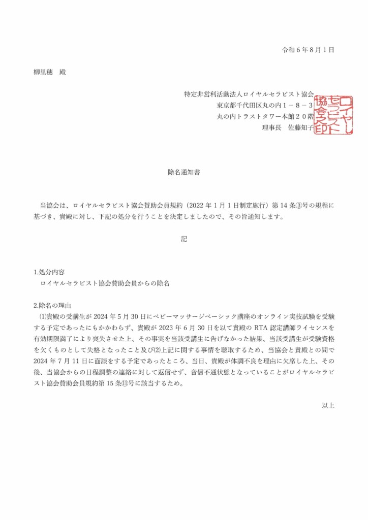 柳里穂氏(新潟県長岡市)の除名処分が理事会で決定されましたのでお知らせいたします。